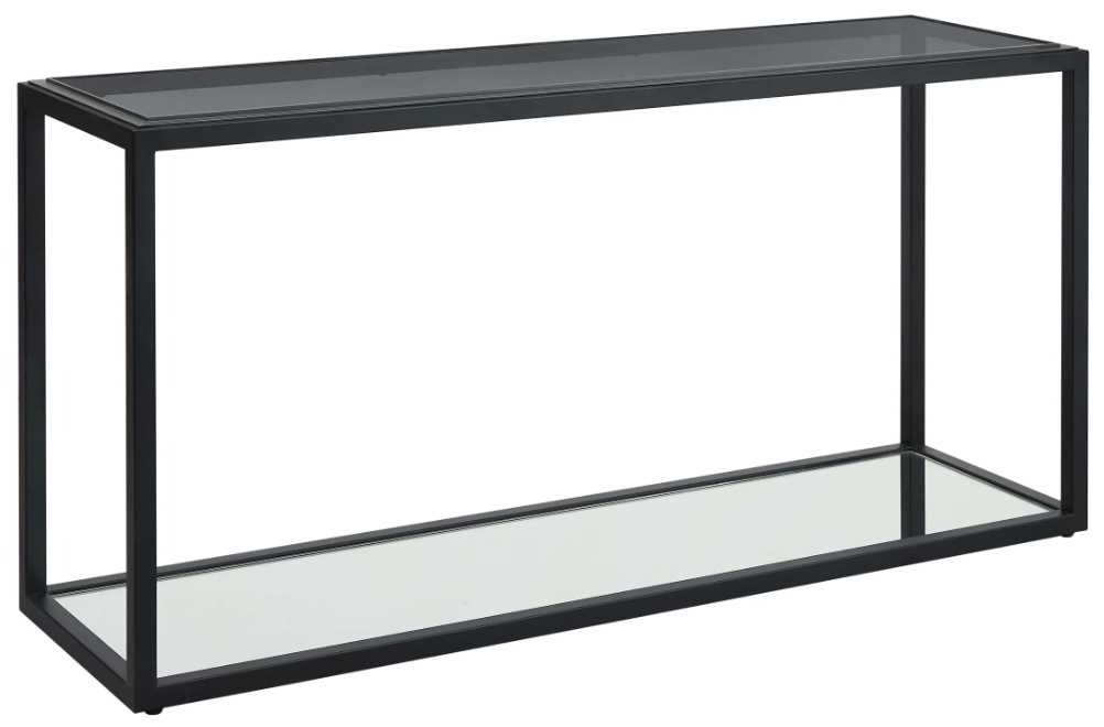 Panes of smoked glass are set flush with a raised gunmetal frame for a subtle step effect while a black metal base and mirrored shelf provide subtle contrast. Complementary materials and color tones result in a nuanced but monochromatic look versatile enough to make it home in any living space.Read More