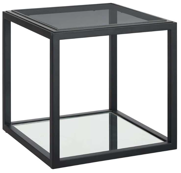 Panes of smoked glass are set flush with a raised gunmetal frame for a subtle step effect while a black metal base and mirrored shelf provide subtle contrast. Complementary materials and color tones result in a nuanced but monochromatic look versatile enough to make it home in any living space.Read More