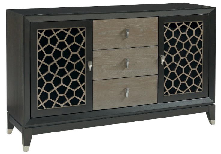 With its variety of textured surfaces and finishes, this server is a stand out piece. Solid-wood construction underlies the beauty of the server. Oak veneers in dark and light gray contrasts with the black acrylic inlays under brushed metal fretwork.Read More
