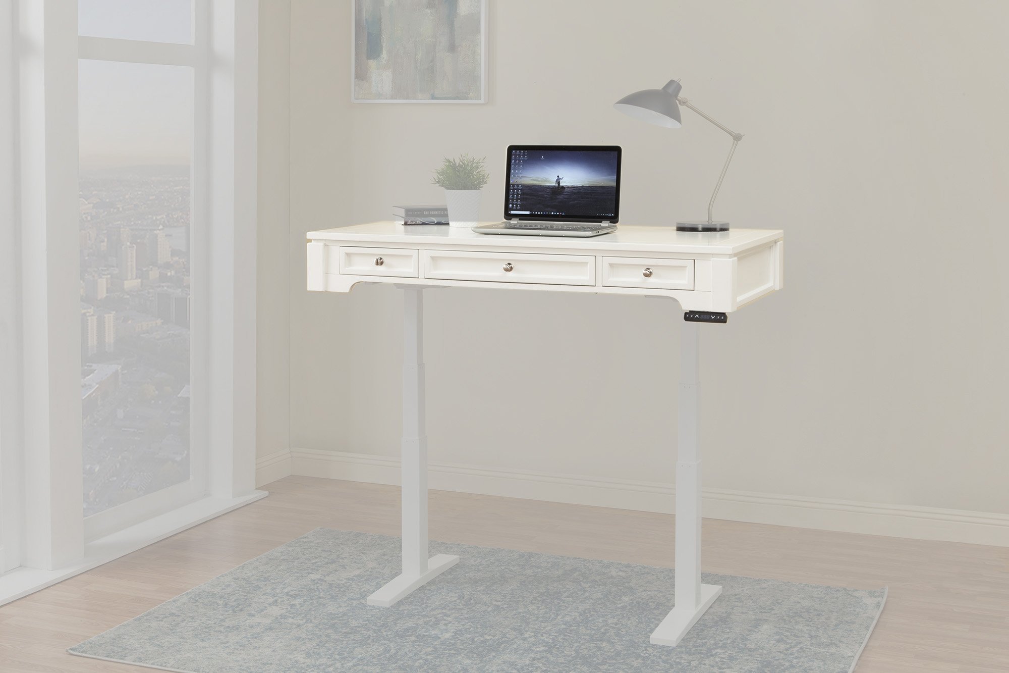 Work with style and ease at this 57-inch Power Lift Desk from the Boca collection. A healthy option that encourages movement, this modern workstation boasts clean lines and a fresh Cottage White finish.Read More