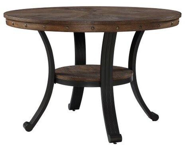 Round dining table features an oak woodgrain veneer with nailheads along the apron