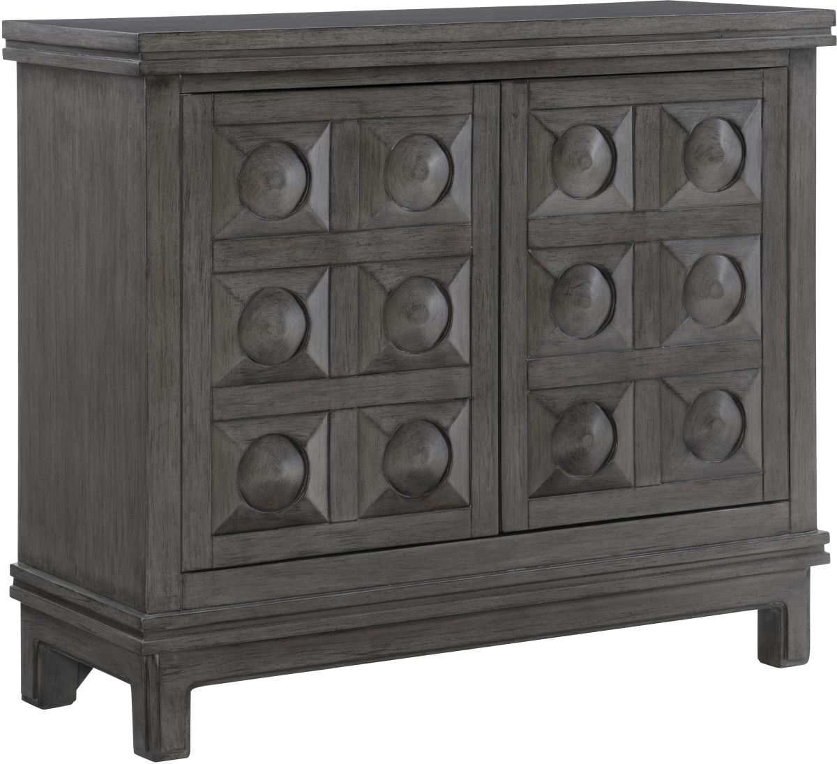 Dramatic raised and dimensional door fronts set this storage cabinet apart. In a rich, multi step grey finish that provides an anchor piece for any room. Arrives fully assembled and ready to impress in a living room, dining room or entryway.Read More