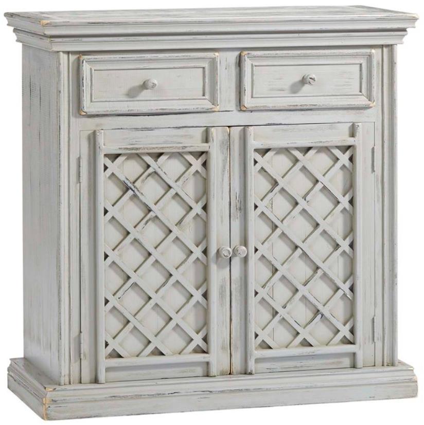 Function and beauty are just two characteristics of this awesome accent cabinet. Cabinet doors have a beautiful lattice design and drawers have a clean and sharp looking picture frame Moulding outlining the function. Finished in a fresh and alluring Antique Gray. Cabinet interior includes one shelf for spacious hidden functional storage.Read More
