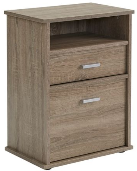 A great small nightstand that has a lot of storage. One small drawer and one larger drawer with an open top shelf for great storage options. Finished in a neutral taupe color that will easily work with many styles today.Read More