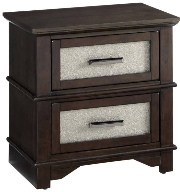 This nightstand features Champagne vinyl inserts with a pebble texture on drawer fronts, shaped under top molding, parting rails and shaped base rail on the bottom. Kenlin metal drawer guides allow for easy drawer function. Black nickel faceted drawer pulls. Chocolate finish contrasts with champagne colored inserts.Read More