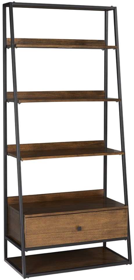 A modern style bookcase with classic understated appeal. Clean lines with mango veneers finished in a warm medium toned Cinnamon color combined with a black metal frame. Generous sized drawer and full open shelves are perfect for storage and display.Read More