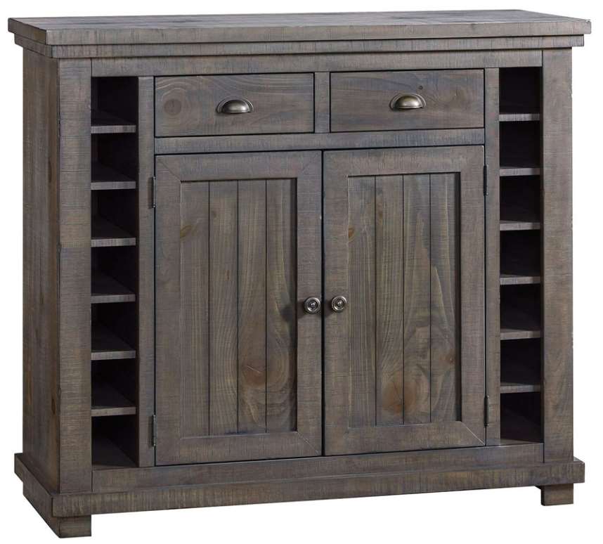 The distressed gray finish has the nature of salvaged wood. The server is 42” high and features doors, drawers and vertical wine racks for ample storage options. Elevate your home décor with this stylish and practical furniture piece.Read More
