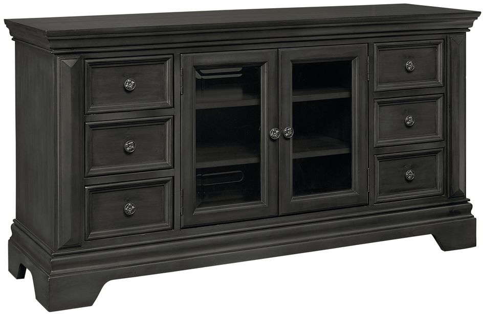 60” Entertainment Consoles have drawers and glass doors over shelves for media storage and cord management slots in the back panel.