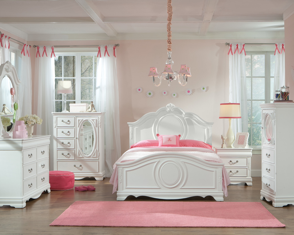 Jessica’s charming cottage details are given a posh silver finish that will add a glamorous touch to every modern young lady’s bedroom space. Set Inlcudes Twin Panel Bed, Mirror, and Dresser.