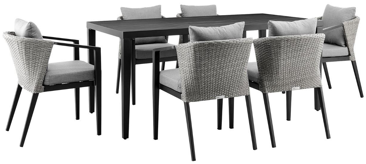 The black finished aluminum frame and table pair beautifully with the grey rattan and dark grey cushions. The Aileen dining chairs can support up to 308lbs per seat and have a seat height of 19 inches. The chic aluminum table and chair frame feature a multi-layer powder coating for effective protection from the weather, everyday wear, and tear. Aluminum is a light material and can be moved from your backyard to your screened-in porch, to your garden with ease, making it the ideal outdoor furniture piece! The Aileen outdoor chairs with cushions feature a modern, clean line silhouette which is complemented further by the beautiful hand weaved rattan rounded seat back. The cushions of this metal and wicker patio furniture piece are removable and feature a zipper closure, making clean up a breeze! The slat style tabletop helps elements to easily pass through which adds to its durability, while the umbrella hole adds to the convenience of this outdoor patio furniture piece.