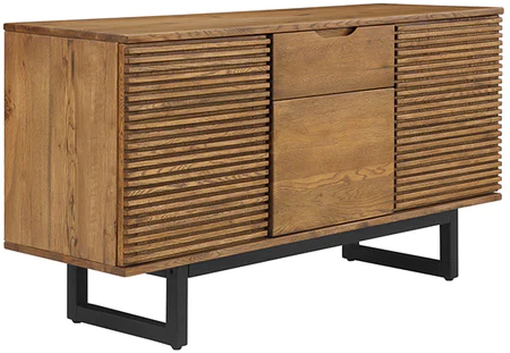 Showcasing the rich grains of oak, our sideboard horizontally arranges wooden slats to attain a mid-century modern and eye-catching facade. Unlike other hardwood materials, solid oak furniture requires minimal maintenance. Because it is a dense wood, it does not scratch or stain easily. Thus, you can keep it looking brand-new, like when you first purchased it. All you need to do is dust it and apply furniture wax at least every six to nine months. It creates a sleek contrast with the black metallic legs to warm up and enliven your living room, dining area, bedroom, home office, or entryway. The Aldo wood buffet features a drawer and three roomy cabinets to serve as a handy and convenient sideboard, storage cabinet, or entertainment center