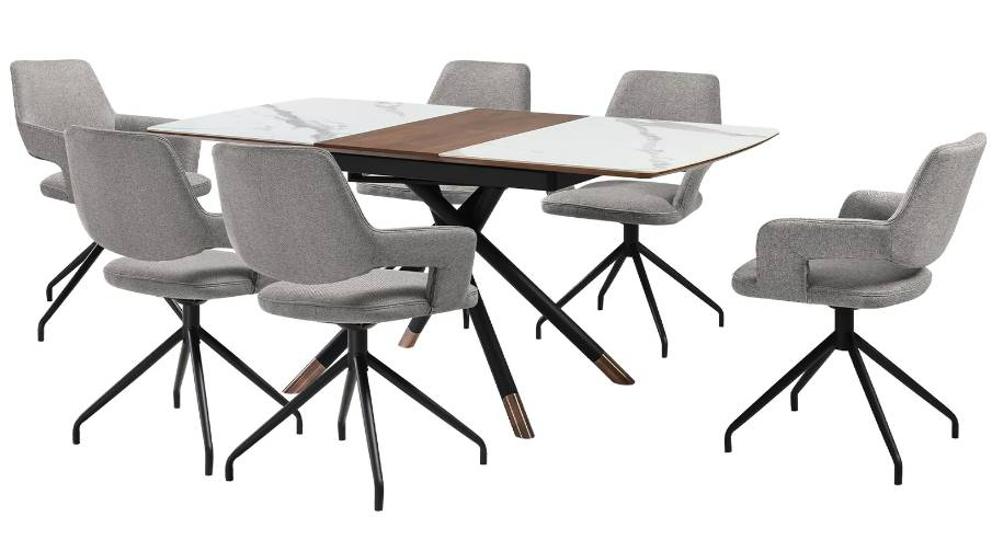 Available in 5- and 7-piece set configurations and features a light grey ceramic and walnut wood top with black metal legs and grey upholstered swivel chairs.