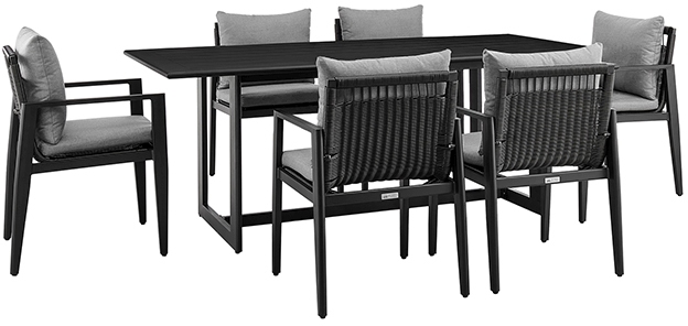 These beautiful metal and wicker patio furniture pieces include plush dark grey high density foam cushions to offer a cozy sitting experience and strong aluminum arms for added comfort. The cushions also feature a zipper closure that allows for easy removal and cleaning, making this the perfect set of outdoor patio furniture! Crafted to perfection the patio table includes a slatted style surface to offer beauty and convenience, allowing the elements to pass through. The chic aluminum construction of this outdoor furniture set features a multi-layer powder coating for effective protection from the weather, everyday wear, and tear. Aluminum is a light and rust proof material and can be moved from your backyard to your screened-in porch, to your garden with ease! Without having to worry about UV, rust, or weather damage, the Cayman patio dining set is ideal for your home, regardless of your location. The Cayman dining set features a black powder coat finish and dark grey upholstery, the dining chairs have a 19-inch seat height and can support up to 308 lbs per seat.