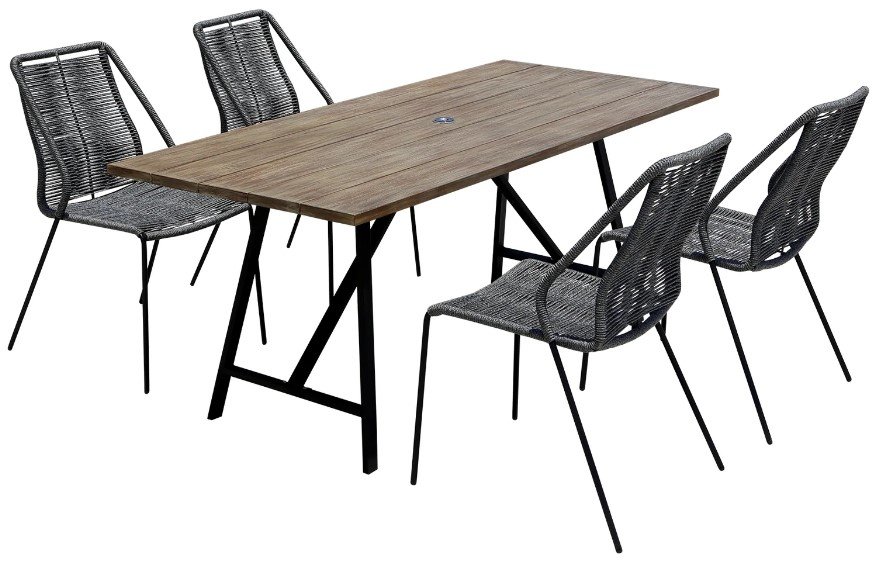 Modern and inviting, our patio dining table combines the warmth of wood with the hardiness of metal. The clean-lined and minimal profile of the table can effortlessly blend and compliment any outdoor space. One of the best reasons to choose eucalyptus wood for your outdoor furniture or four-seasons porch is that it is exceptionally resistant to decay and rot. It naturally resists the influence of moisture because of the high oil content it naturally contains. That means it can get damp without you worrying about whether damage will occur. It can withstand several different outdoor elements while lasting for many years if it receives proper care. The Frinton's trestle base allows for maximum seating space as it makes the table virtually legless and allows for the full surface of the table to be used and no corner legs that would limit dining chair space. The Frinton rectangle dining table is 71 inches long and features a convenient umbrella hole to keep you out of the sun. The Clip chairs feature an intricately woven rope seat and back that offer extreme comfort and relaxation. The resilient regatta rope cording is treated so that it's protected against the weather and the supportive weave allows the outdoor elements to pass through effortlessly when the chairs are not in use. The Clip chairs are stackable and can be stored or moved with ease. This 5-piece patio dining set is a great choice for outdoor meals, game nights, celebrations, and more! The Frinton and Clip dining set is available in your choice of a dark eucalyptus finish with black dining chairs, or a light eucalyptus finish with grey dining chairs.