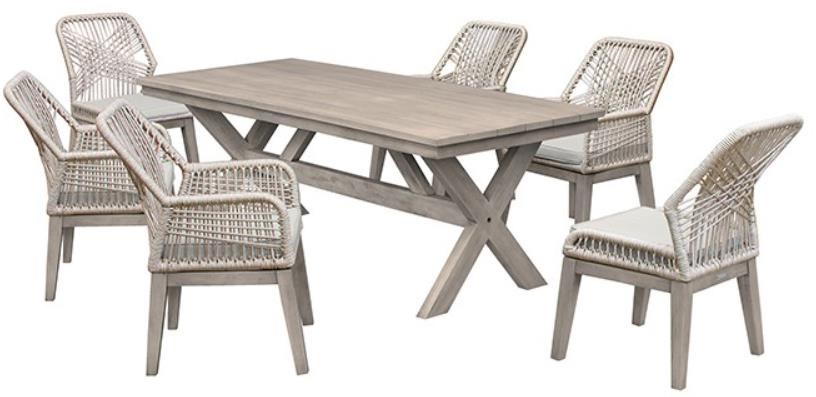 The outdoor dining table trestle base allows for maximum seating space as it makes the patio dining table virtually legless and allows for the full 82-inch-long surface of the table to be used and no corner legs that would limit dining chair space, making it an ideal choice for a dining table set. The costa chairs are constructed from acacia wood and rope, these durable materials come together in harmony to create the perfect seat to dine, entertain, lounge, or read. The unique weave of this patio dining set runs on the back and arms of the chairs creates a soft yet modern aesthetic. The rope is rot-proof and resistant to mildew, mold, acids, and alkalis. The grey cushions feature a convenient zipper closure which makes the removal and cleaning of the cushion covers a breeze. The polyester upholstery is not permeated easily by water. Secondly, polyester resists the types of molds and mildews that will take root in fabrics made of natural fibers. This outdoor patio dining table set is ideal for your backyard, patio, screened in porch, or pool area. This set includes 1 grey acacia wood dining table, and 4 grey rope and grey acacia dining armchairs, and 2 dining side chairs with grey cushions.