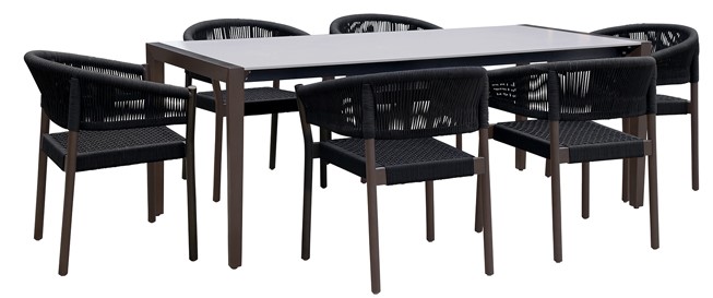 The masterfully crafted Fineline outdoor dining table features a unique tabletop made of a 5-layer composite with 2 layers of cement fiberboard surrounding the aluminum honeycomb core. This beautiful tabletop is durable and robust - capable of withstanding inclement weather and everyday wear and tear. Eucalyptus is a good choice for garden furniture as it has antifungal and antimicrobial properties. This means it has an inherent property to resist decay, rot and garden pests and can face the harshest of adverse climate–whether harsh sun, icy cold winds, cruel snow, or torrential rain. It is also rich in oil that naturally repels moisture and water. For these reasons, eucalyptus outdoor furniture can go on for many, many years and prove cost-effective to its owners. The Doris Chairs are wrapped in resilient regatta rope cording, providing supple support while still allowing for element passthrough - also enhancing your seating experience with a softness that rivals most fabrics. The open chair back creates a breathable seating option that keeps you comfortable while you are seated and the bonus of these chairs being stackable makes this set even more convenient. The Fineline and Doris Indoor Outdoor 5 Piece Dining Set in Dark Eucalyptus Wood with Super Stone and Black Rope is ideal for any home and comes complete with one Fineline Indoor Outdoor 80" Rectangle Dining Table in Dark Eucalyptus Wood and Super Stone and 4 Doris Indoor Outdoor Dining Chairs in Dark Eucalyptus Wood with Black Rope.