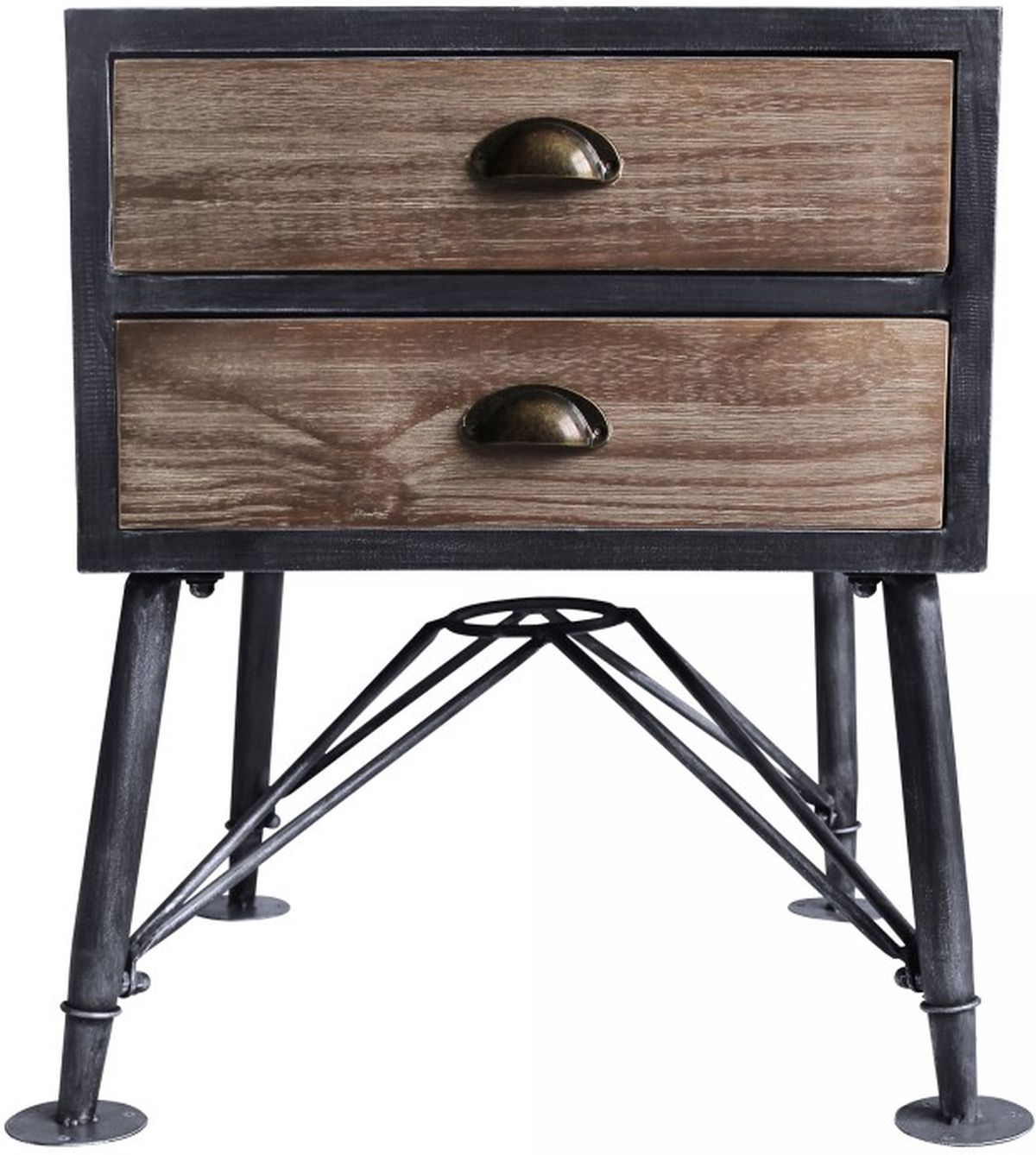 The Armen Living Mathis industrial 2 drawer end table is a terrific choice for the contemporary household. The Mathis’s durable Industrial Grey metal frame is complemented by its sturdy pine wood drawers. The drawers feature downturned metal handles for easy use and are perfect for storing late night reading materials. The Mathis’s top provides an excellent surface for tea cups or bedside lamps. The unique base of this modern end table features a four leg design that is certain to invite attention. The beautiful Mathis is perfect when paired with any Armen Living bed and is ideal for the bedroom. The Mathis comes assembled.