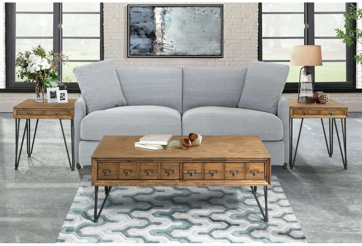 The end tables come with a pull out tray, perfect if you stepped up your home decor game and need just a little extra space for a beverage. The drawer and tray fronts feature an apothecary style look, in a bronze metal. The dark metal hairpin legs complete the look and pairs beautifully with the light walnut finish.