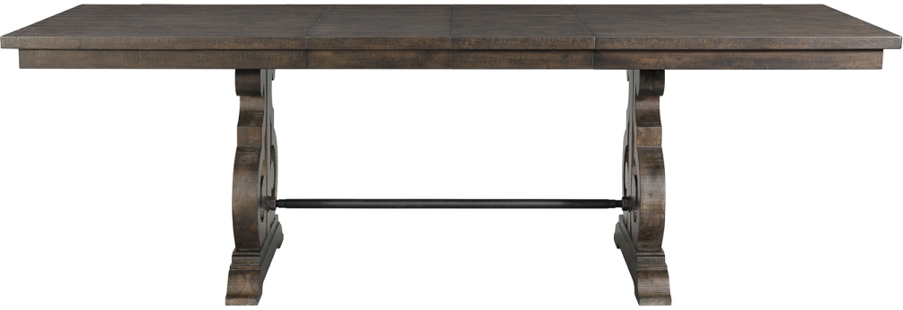 The Stone Counter Height Dining Table is the perfect table for your dining room! This rectangle table design can easily expand to accommodate extra guests thanks to its two 18" leaves. The intricate trestle table base gives this table its flair. Distressed markings are visible throughout, pairing beautifully with the smokey walnut finish. This table will be a staple in your home for years to come thanks to its transitional style.