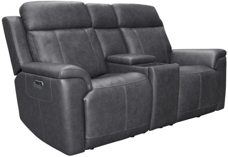 Unwind after a long day with the Amelia power reclining loveseat with console. This charcoal gray, top grain leather loveseat features a generously scaled frame, contoured seats, and padded arms with a welt trim. A center storage console provides a place for remotes and more.