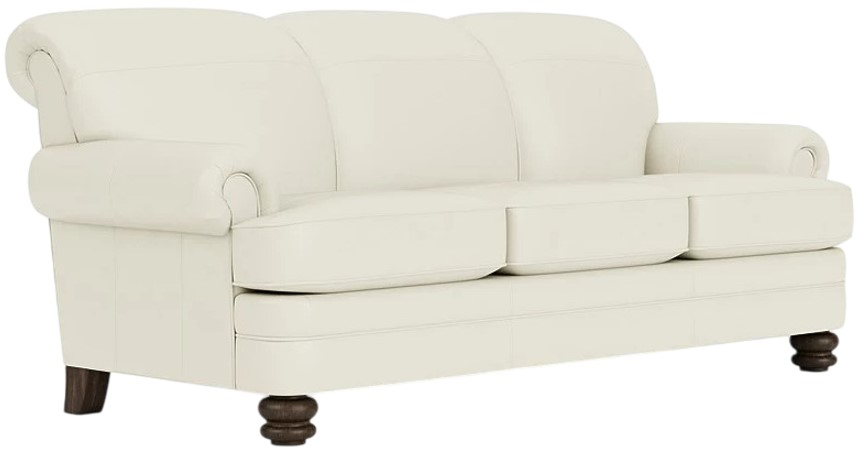 This inviting sofa features soft leather and attached back cushions, ready for relaxing whenever you are.