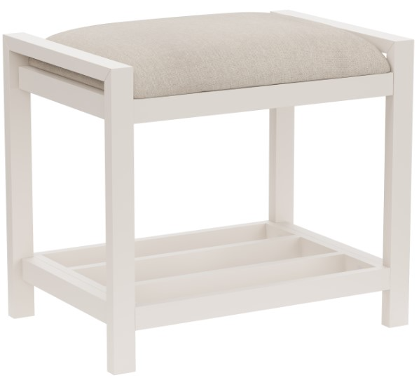 Casual style backless rectangular vanity stool in white wash with shelf storage