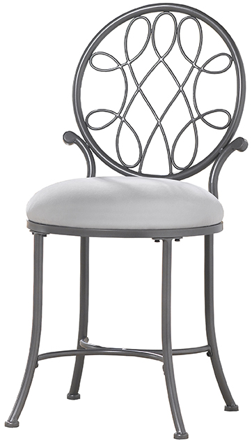 The Hillsdale Furniture O'Malley Vanity Stool is the pinnacle of strength and grace. A robust tubular steel circular chairback houses delicate Celtic knot metal work. The sturdy flared legs and inverted arch stretchers are the foundation of this elegant vanity seat; the Gray upholstery beautifully complements the cool metallic Gray finish.