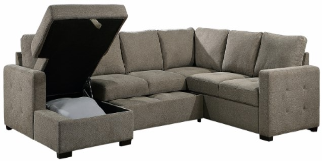 While hidden storage within the left-side chaise provides convenient placement of soft goods or accessories. The Elton Collection is offered in a brown textured upholstery, solidifying its versatile design.