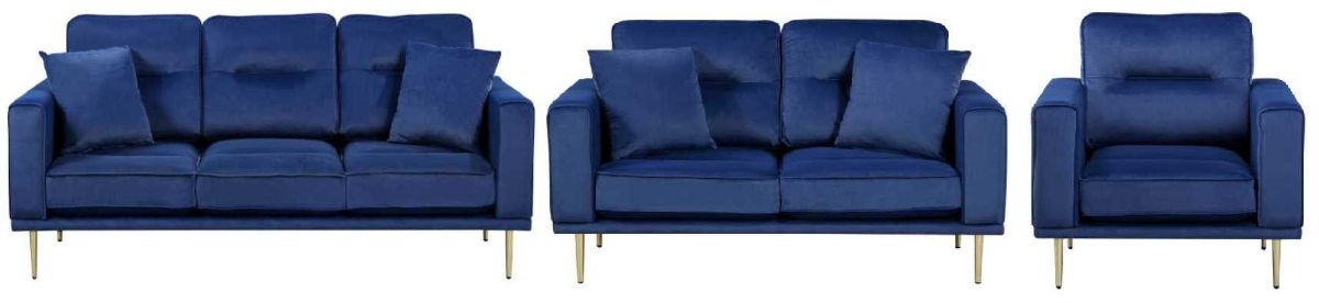 Modern lines, glamorous texture, and exquisite style comprise the design of the Violetta Collection. Track-style arms provide defining detail to the sofa, loveseat, and chair profile while gold finish metal legs lend support and stunning contrast. Blue velvet fabric upholstery lends a soft touch to your seated experience, while reversible back cushions further the collection's functionality.Read More