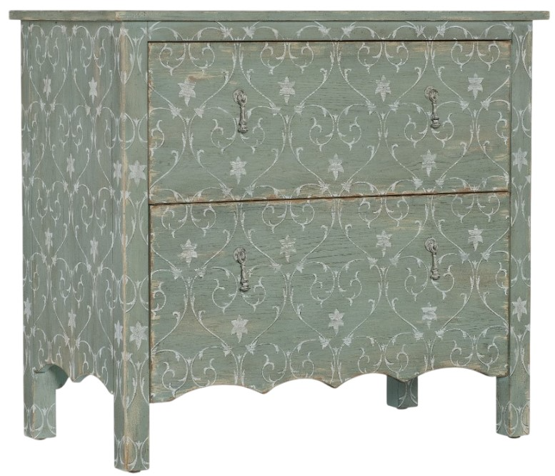 In a classic, charming design with a nostalgic flair, the Americana Two-Drawer Accent Chest has a scalloped-bottom shape and is finished in a soft Antique Green with distressing and rub-through over Oak Veneers. A white scroll pattern covers the exterior, and the interior has a Honey finish.Read More