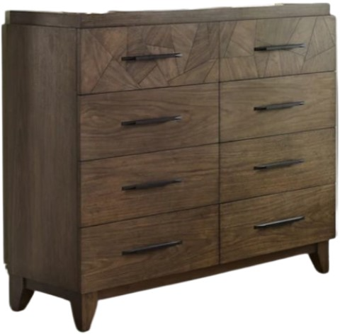 Random angularity meets straight-lined minimalism in this distinctively modern bedroom. Figured Black Walnut veneer patterns are simultaneously juxtaposed with stairstep moldings and mirrored in angular tapered feet. A true medium walnut finish with a matte lacquer top coat lends itself to mid-century and maximalist decor.Read More