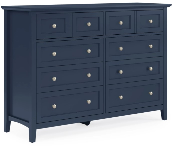Starting with classic shaker-style drawer fronts, this timeless bedroom collection adds crisp lines and an all-new blueberry finish to create a look that blends seamlessly with modern, farmhouse, coastal and transitional decor. Gently tapered legs, beveled floating tops and smooth black knobs complete the look.Read More