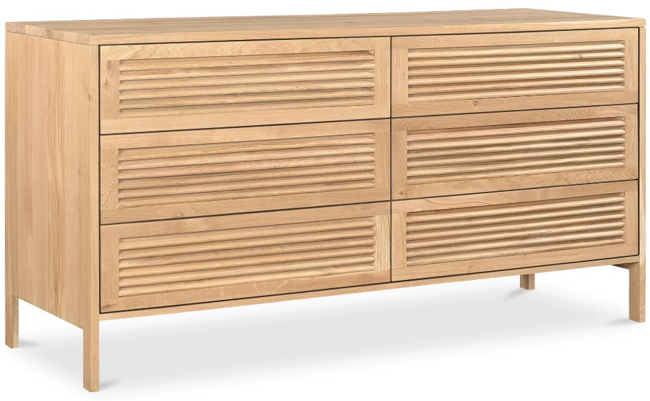 Clever arrangement of slats creates an exquisite play of light and shadow, a stunning visual element that adds depth and texture to any space. Crafted from solid oak, the dresser exudes timelessness while providing ample storage.