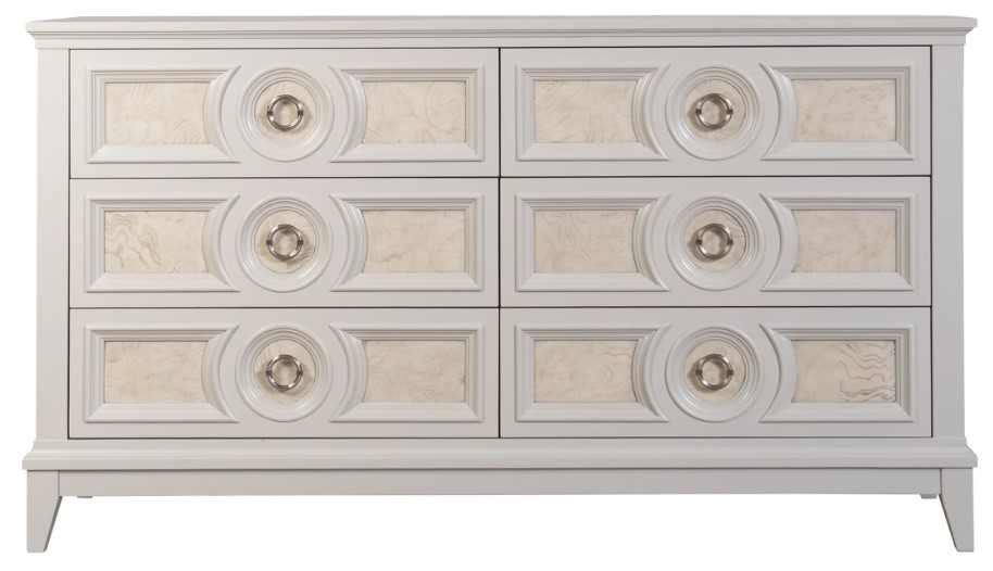 This eye-catching dresser is original in design and useful with six large drawers to store all your clothing. Finished in clean white, the light-colored ash burl veneers add the gravity of marble with the lightness of wood. With specially-design circular drawer pulls, the distinctive details come together creating a beautiful whole.Read More