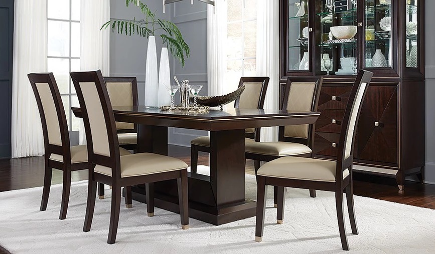 The Woodbridge dining was built not only with elegance and sophistication in mind, but also with quality craftsmanship to ensure it will remain the centerpiece of the home for years to come. The table, with its sturdy, elaborately shaped pedestal base lends it character and the smooth, beveled top with gold-accented inlay creates a unique dining experience. The side chairs feature curved backs to ensure comfort along with quilted easy-to-clean PU upholstery that’s smart while providing durability. Beveled fronts and reflective acrylic trims in the server allow it to stand alone or be paired with a hutch for additional display.