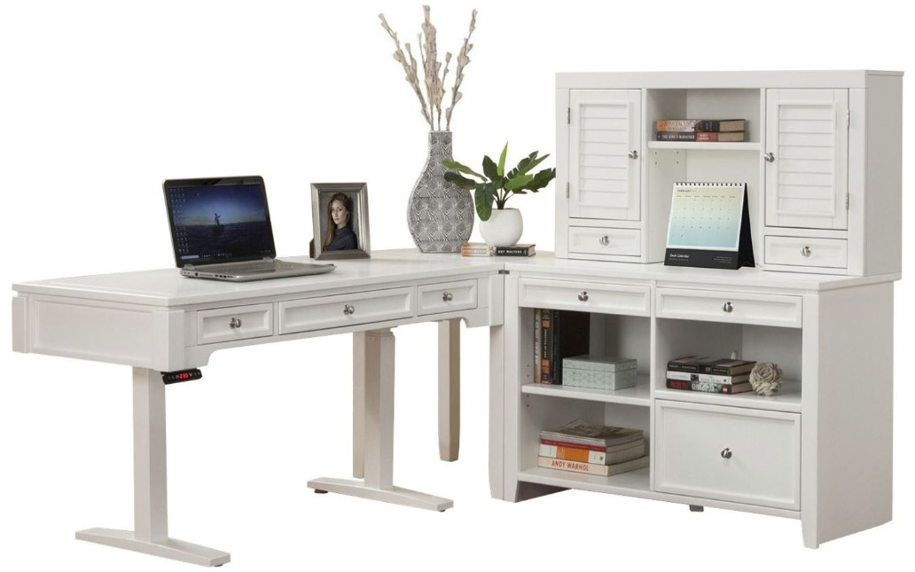 Set includes power lift desk and credenza