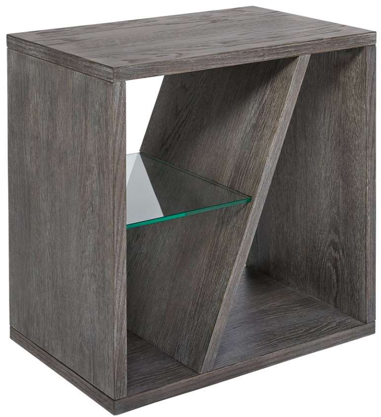 For the modernist. A cool architectural design with clean lines, great angles, and glass shelves. Finished in a cool gray color slightly weathered to add a little casual effect. A perfect choice for your transitional needs.Read More