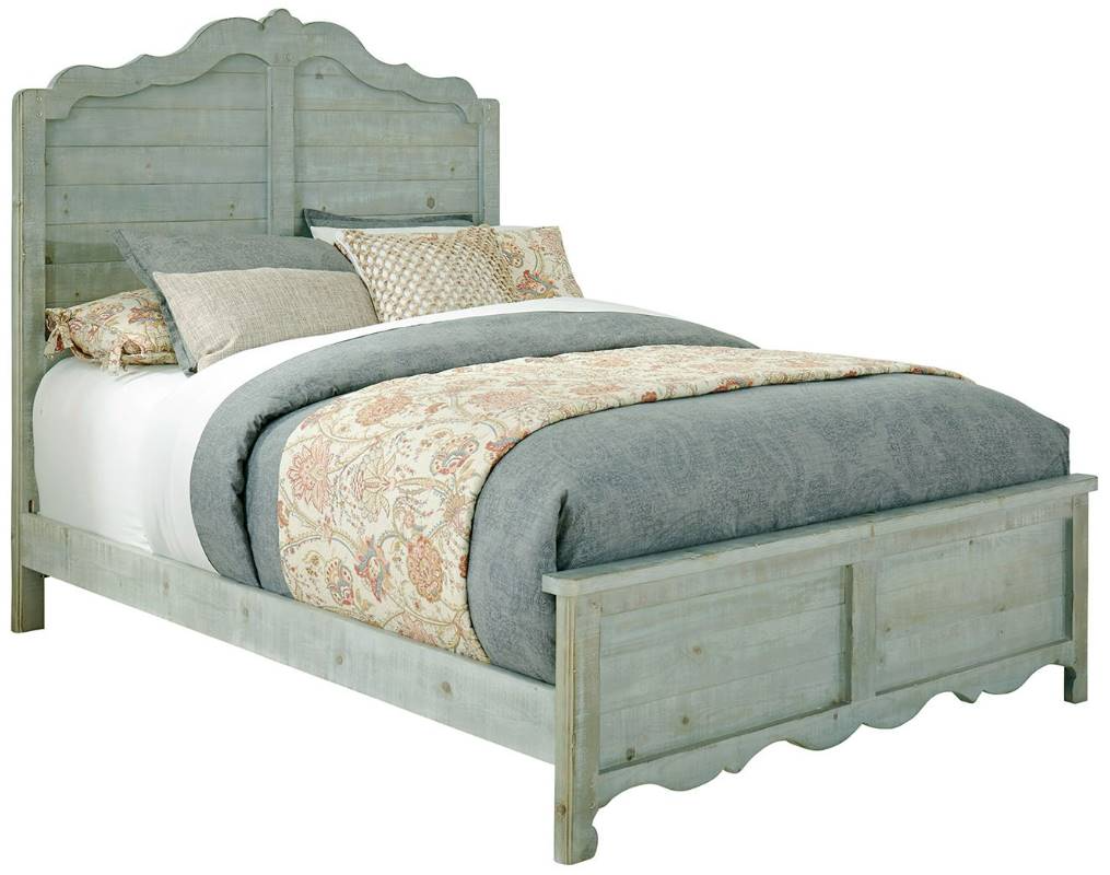 This bed features flowing molding that captures horizontal solid wood planking. Footboard features scalloped base molding. Mint finish is hand applied on rough sawn pine to achieve a vintage, one of kind look.Read More