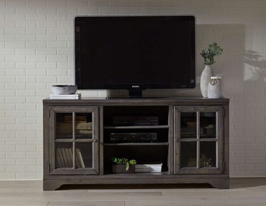 This 66 Inch Console features decorative top molding, framed glass doors, open shelving, shaped bases, bronze finished knobs, grommets for wire management, and can also be used as a stand alone piece.Read More