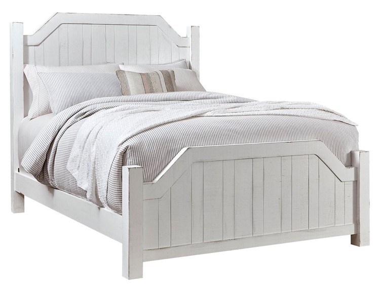 It has just enough surface texture to work with a multitude of bedding styles. This bed features a unique angular shape with a vertical wood planked design on the headboard and footboard. Constructed of solid pine with a dry brushed white finish.