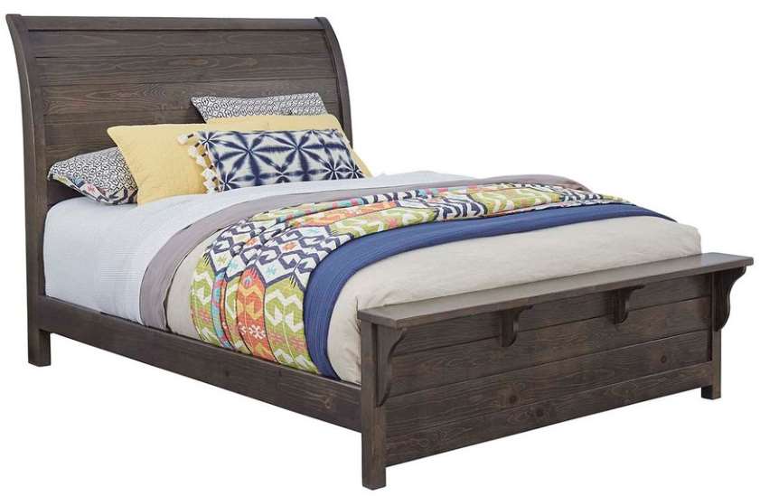 Bed features a sleigh headboard and footboard has a wide top rail with bracket supports underneath, just wide enough to sit on.