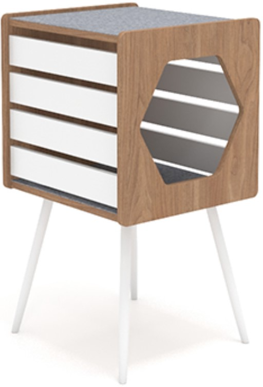 This cat stand features a felt surface on the top and bottom panels for a comfortable place to relax on top of and inside of this square cat house. The polygon shaped entrance and slatted sides bring an eye-catching design to any room in your home. The metal legs of this felt cat bed are powder coated, allowing for durability and stability for years to come. Cat houses should be able to be displayed from every angle. That’s why this one is finished on all sides for a polished look no matter where it sits. Finished in Serene Walnut™ with White accents this cat stand with bed puts the purr back in purrfect.
