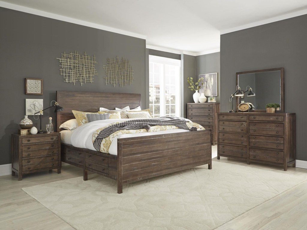 With a beautiful slightly lived in rustic look, this bedroom collection is exactly what you've been looking for to give your bedroom that woodsy look you've been dreaming of. Give your bedroom an relaxing rustic vibe with this storage bed. The two side drawers on this piece allow you to make the most of your limited bedroom space, offering you room to store extra clothes or warmer blankets for those extra cold winter nights. Make the most of the space in your bedroom by adding this rustic dresser. Eight drawers, including two shallow drawers, offer a variety of storage options for your clothing and accessories. The rustic styling of this piece will bring a relaxed homey vibe to your bedroom that you will cherish. This set also includes a mirror.