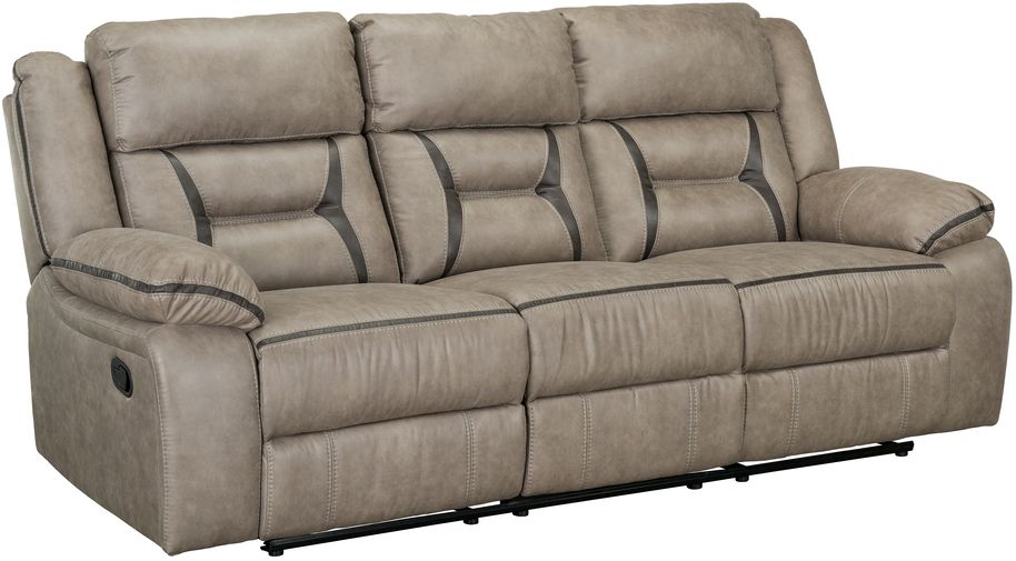 Manual motion loveseat. Material is leather. Come in color taupe.Read More