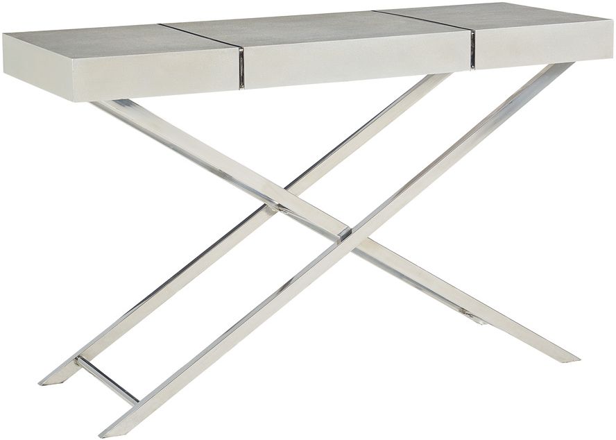 Cutting edge Ava Silver Console Tables have a bold modern geometry with striking stainless steel X-bases and silvery textured tops accented with slender metal strips.Read More
