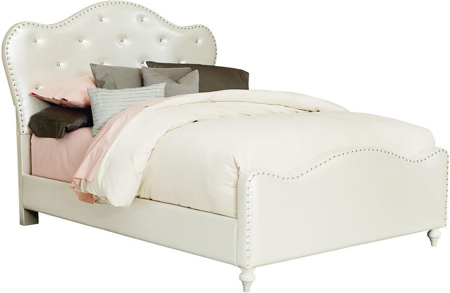 Curvy and glam, Caroline Beds will add a fun sophisticated focal point to girls’ rooms with their jeweled button tufting, pearlescent white fabric and shiny silver tack trim.