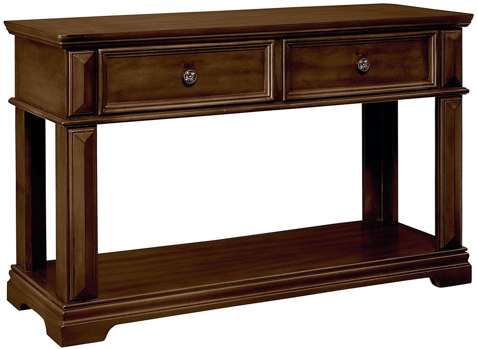 This two drawer Console Table has cast metal ring pulls and knobs with traditional styling in an antique nickel finish.