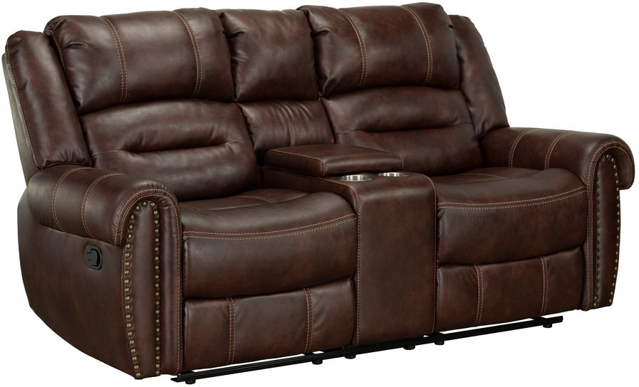 Manual motion recliner with flip top storage console. Roll arm with nailhead accent. Padded plush headrest and chaise seat cushion for all day comfort makes this a wonderful addition to your living room. Matching recliner and sofa also available to complete the living room collection.