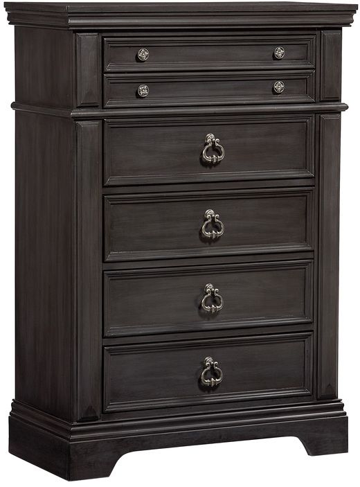 Dentil, cove and ogee moldings. Raised bead frames on drawer fronts and bed panels. Grey finish with satin nickel hardware.Read More