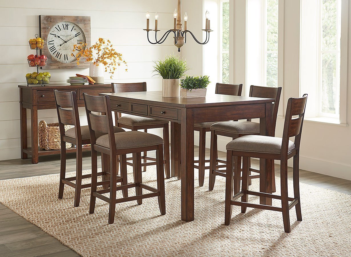 The Kyle Dark Dining Counter Height Table and Chairs set provides a compact versatility that can be styled traditionally or contemporarily. The walnut brown finish with exposed wood grain and two drawers for storage in the top provide a stylish dining solution for up to six, or as a kitchen island for light meal prep. The linen-like polyester upholstery chairs don't skip on comfort, and the slat-backs give ample support.Read More
